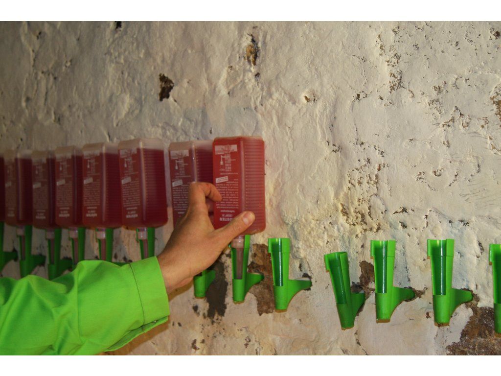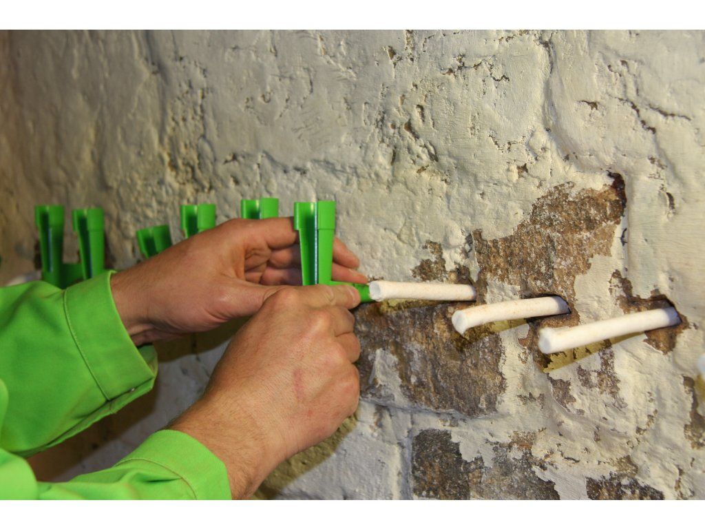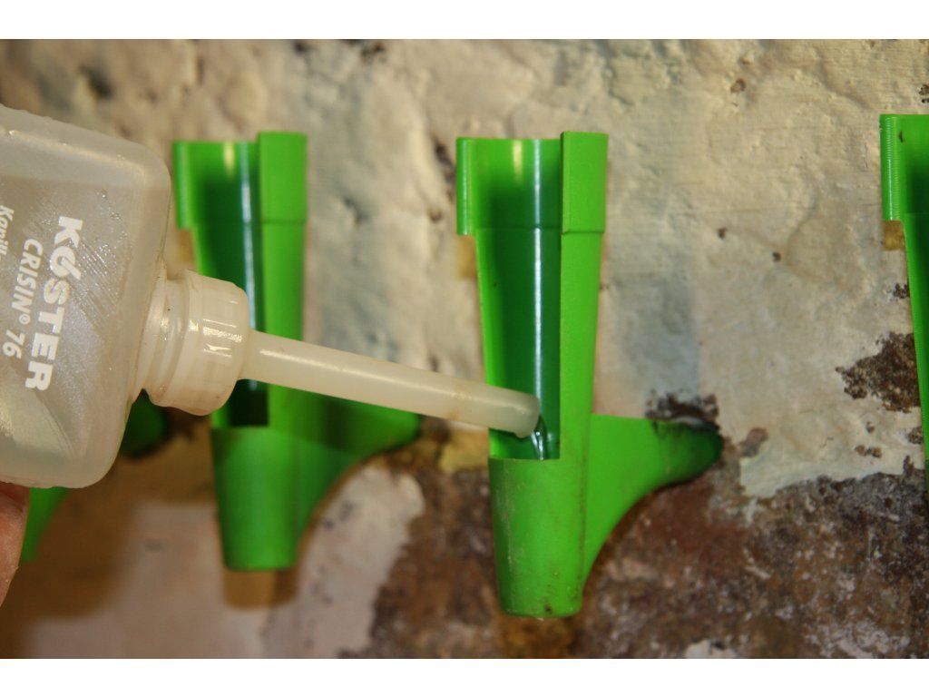 Patentovaná kapilárová tyčinka KÖSTER Cappilary Rod sa osadí do vyčistených vrtov. Na jej voľný koniec sa do vrtu osadí plastový rohovník Koster Suction angle, cez ktorý tyčinka absorbuje injektážnu zmes a uvoľňuje ju rovnomerne a priamo do muriva, účinne premosťuje trhliny a dutiny. V dutinách nie je zbytočný materiál. Plastový rohovník je špeciálne tvarovaný pre nasadenie kartuše s injektážnou hmotou (napr. KÖSTER Crisin 76 Concentrate). Po vsiaknutí sa injektážnej zmesi do muriva a sa tyčinky vyberú a diera sa zapchá hydroizolačnou rýchlotuhnúcou vysprávkovou maltou KÖSTER Repair Mortar. Následne sa môže omietať sanačnou omietkou (hrubá omietka KÖSTER Restoration Plaster a štuková omietka KÖSTER Fine Plaster), prípadne osadiť odvetrávaciu lištu, ktorá v kritickom mieste urýchli odparovanie zvyšnej vody z konštrukcie.